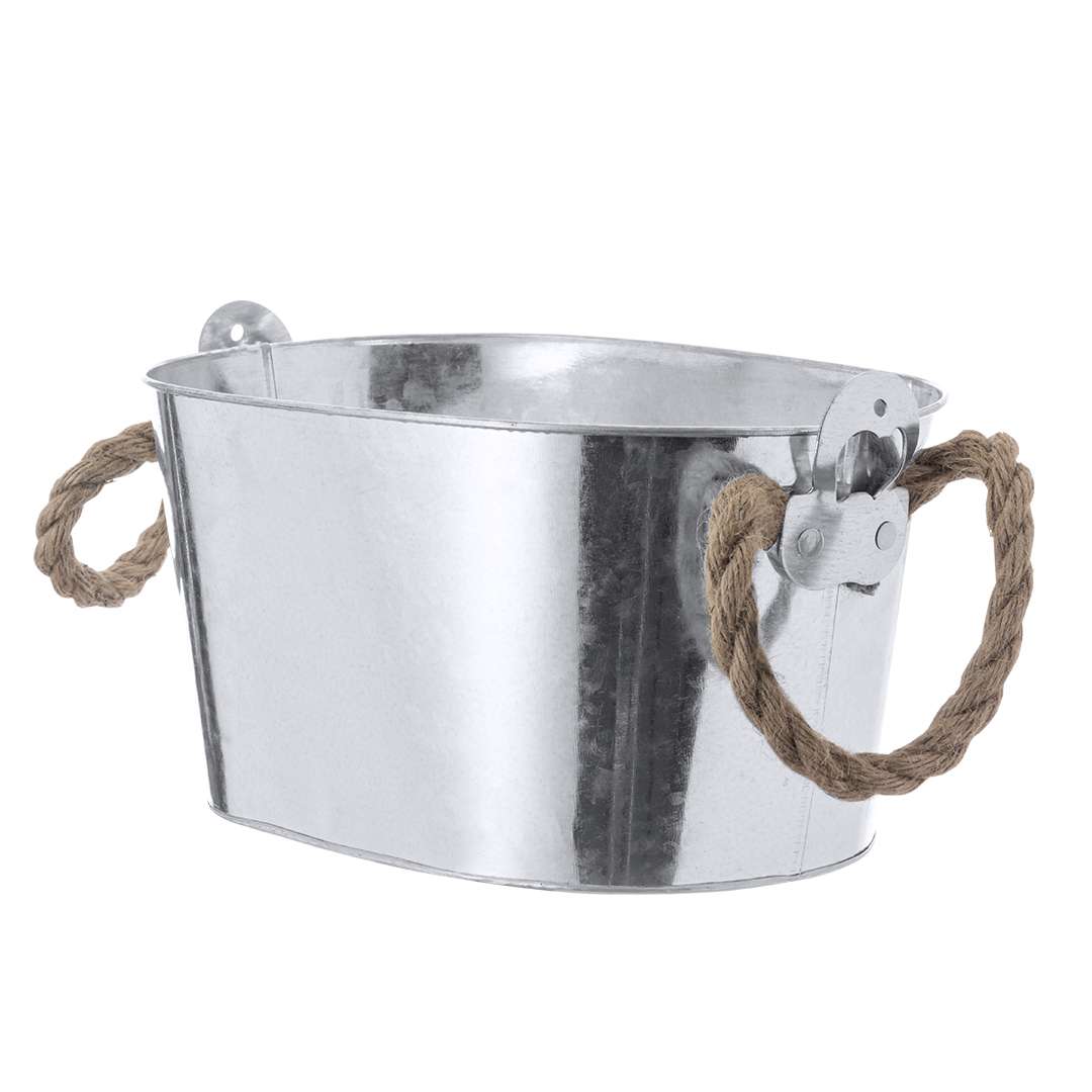 Fantastico secchio in metallo da 6 L per la conservazione di bevande fredde. Perfetta fusione di stile e utilità, con aperture fisse alle estremità e grande capacità. Design robusto con manici in corda per un facile trasporto.