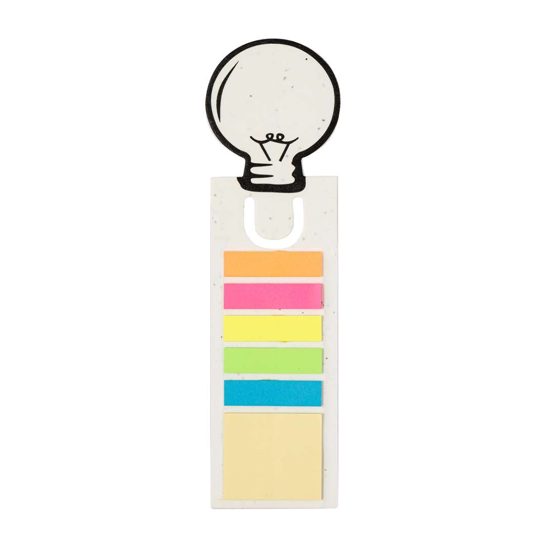 Originale segnalibro in carta di semi, con il caratteristico disegno di una lampadina sulla parte superiore. Dispone inoltre di post-it adesivi di varie forme e colori: 15 post-it 4x4,5 cm in giallo e 75 mini post-it 1,2x4,5 cm in cinque colori diversi. La carta include semi di petunia, che la rendono piantabile alla fine del suo ciclo di vita. Include istruzioni per la semina sul retro della copertina e viene fornito in un sacchetto individuale di carta riciclata.