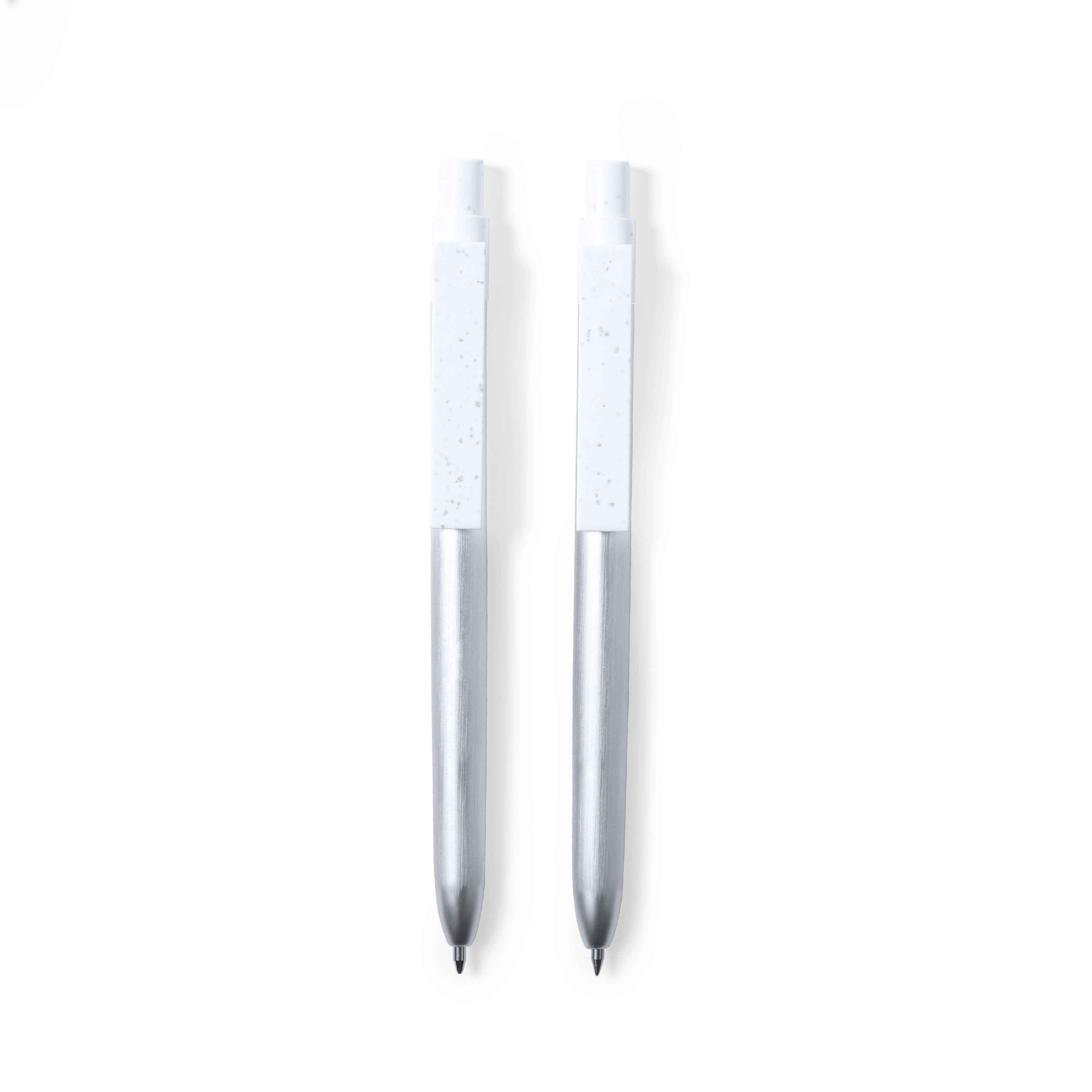 Set ecologico penna e roller, realizzato in alluminio riciclato con dettagli in ABS riciclato (RABS). Include: Penna con meccanismo a pulsante in alluminio riciclato, con fusto color argento e finiture bianche. Con tappo superiore in alluminio riciclato, cartuccia jumbo e inchiostro blu. Roller a pulsante in alluminio riciclato con fusto argentato e finiture bianche. Con etichetta alluminio riciclato sulla parte superiore del roller, cartuccia jumbo e inchiostro blu.Il set è presentato in un astuccio individuale dal design kraft con custodia abbinata.L'origine dell'alluminio riciclato risiede nella riutilizzabilità quasi infinita di uno dei materiali potenzialmente più riciclabili senza perdere le sue proprietà. Questa caratteristica lo rende un materiale ecologico di origine riciclata, facilmente riciclabile e dal cui trattamento e dai cui processi di scarto per l'ottenimento del materiale si possono ottenere nuove risorse riutilizzabili, consumando meno energia nella sua produzione, oltre ad altri fattori di sostenibilità.Certificazione GRS (Global Recycled Standard), che garantisce l'origine riciclata del materiale utilizzato per la fabbricazione del prodotto.