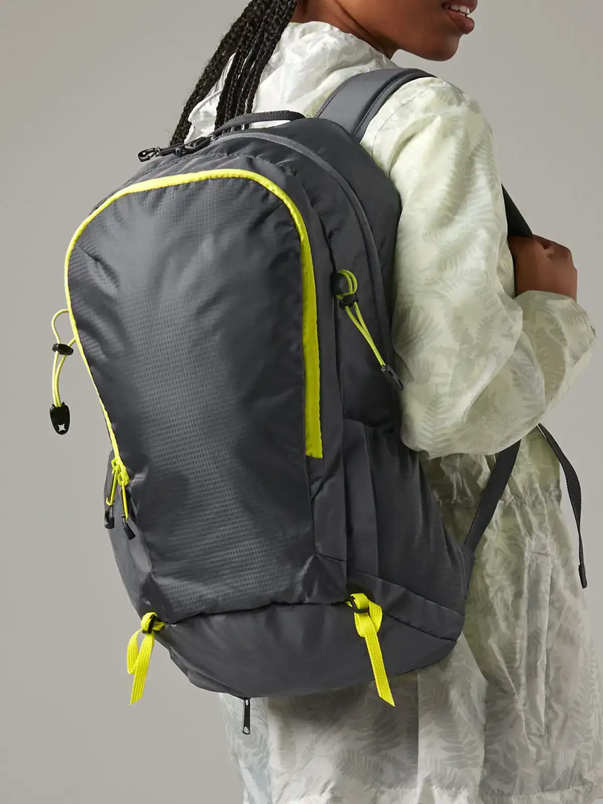 100% poliestere 210D. Zaino ultraleggero, con attacco per bastoncini da trekking, tessuto resistente all'acqua, copertura impermeabile rimovibile, tasca anteriore e interna con cerniera, tasche laterali in rete elastica, pannello posteriore ventilato, inserti riflettenti, con manico. Etichetta strappabile. Dimensioni: 30x50x21 cm, capacità: 25 litri, area di stampa: 20x25 cm.