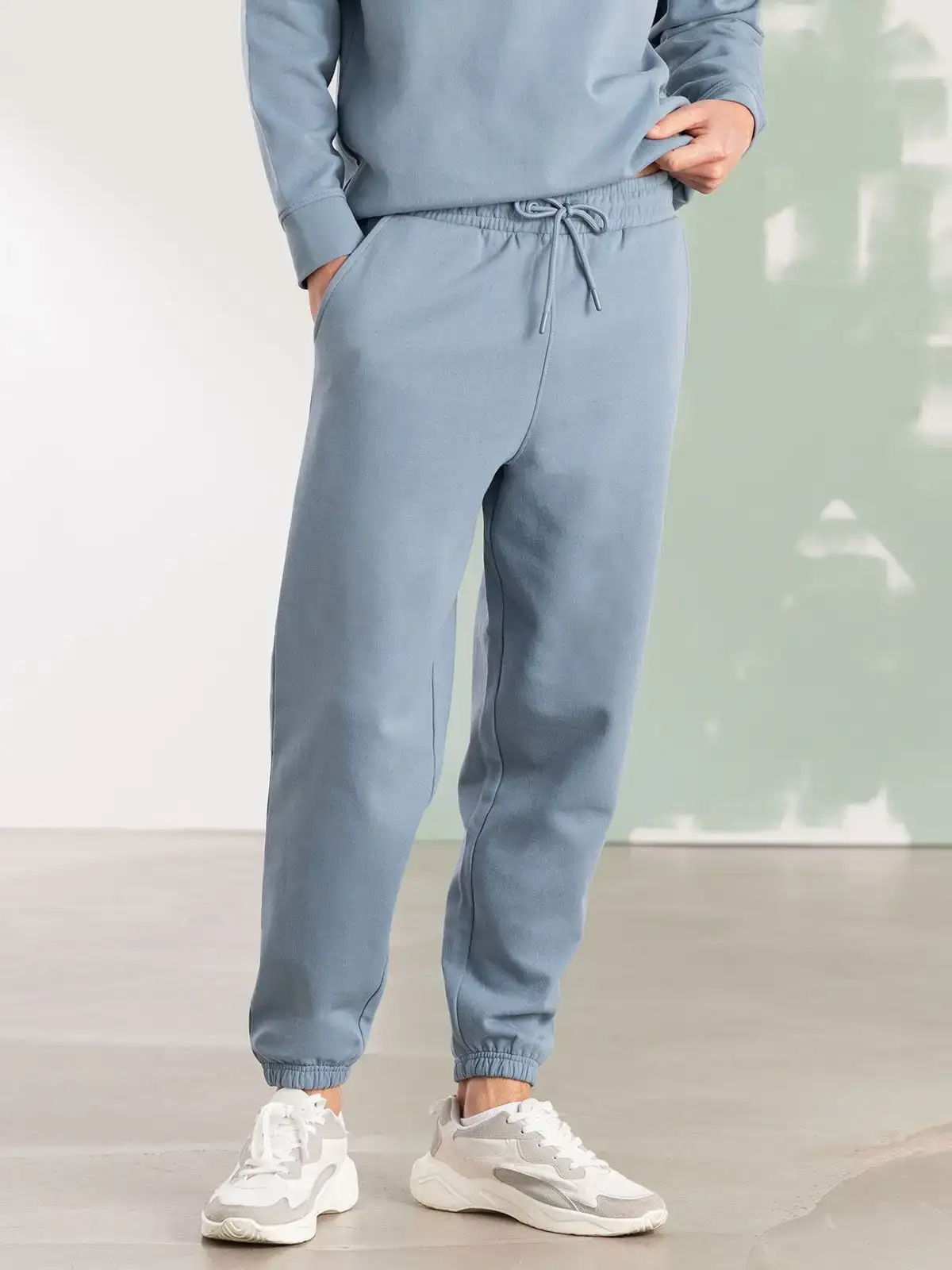 60% cotone rigenerato 40% poliestere riciclato. Pantaloni in felpa unisex dalla vestibilità ampia, felpati internamente. Vita e polsini elasticizzati, cordino tondo in vita, due tasche laterali, una tasca sul retro, cuciture in tinta. Etichetta senza brand. Busta riutilizzabile 100% plastica riciclata.