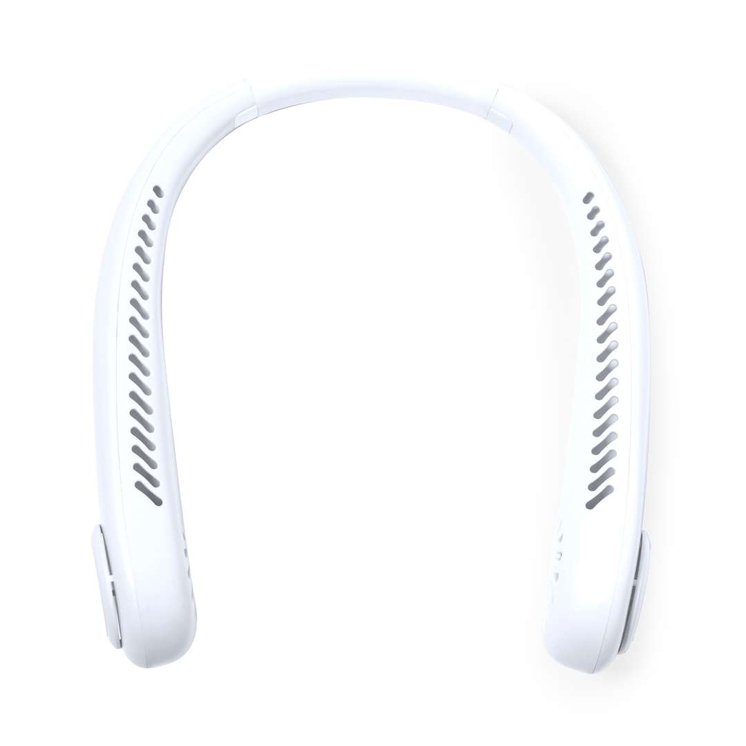 Pratico ventilatore portatile realizzato in resistente ABS. Questo elegante ventilatore ha un design a forma di collana da posizionare intorno al collo, fornendo una sensazione di freschezza. Offre tre diverse impostazioni di velocità ed è ricaricabile tramite la batteria da 800 mAh, cavo Micro USB incluso. Presentato in una scatola dal design kraft.