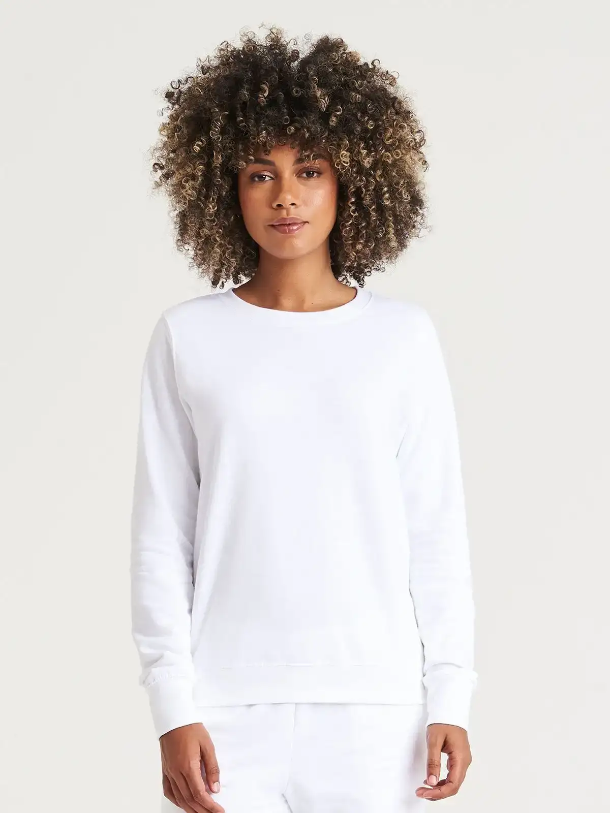 80% cotone, 20% poliestere. Felpa girocollo, felpata internamente, taglio femminile classico. Cuciture doppie, polsini e orlo a costine. Tessuto morbido sul davanti per una superficie di stampa ideale. Etichetta tear-away ideale per il rebranding. 75% cotone 25% poliestere (Heather Grey).