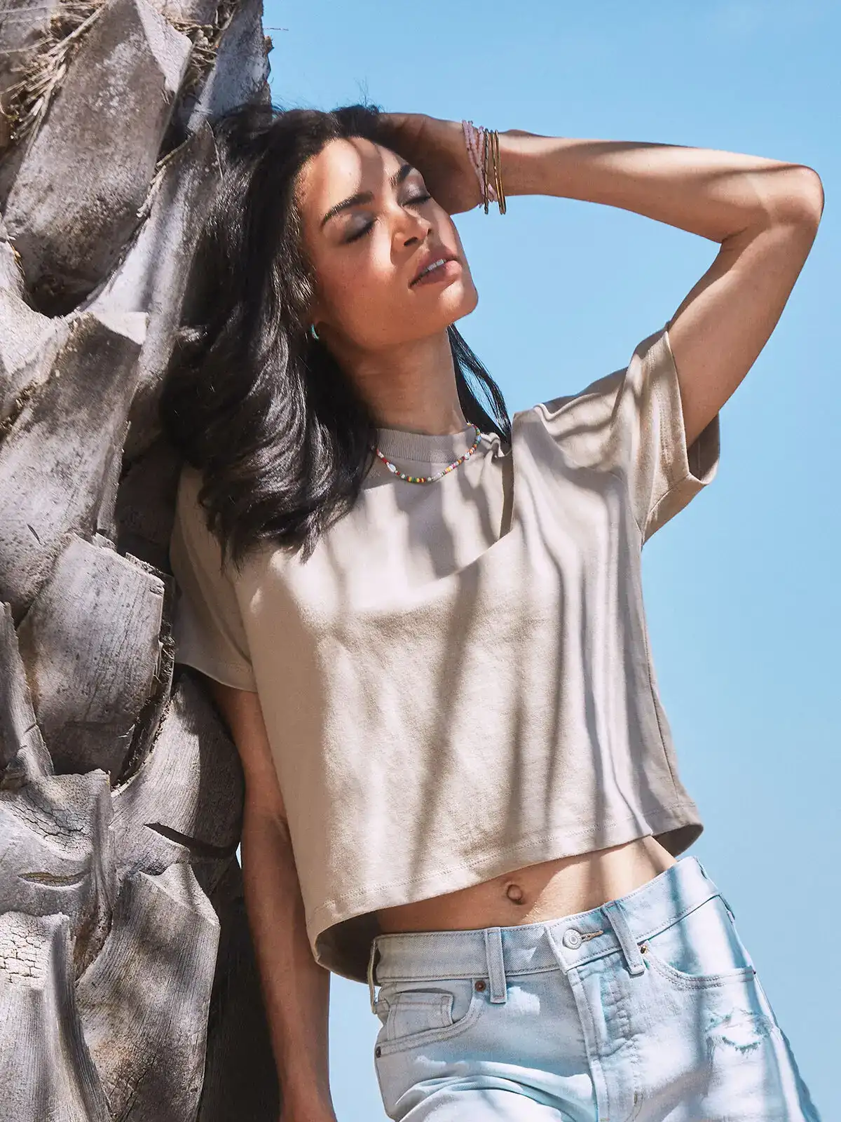 100% cotone ringspun. T-shirt donna oversize, modello crop con cuciture laterali, girocollo in costina, nastro di rinforzo da spalla a spalla. Etichetta al collo strappabile. Col.H001: 90%cot. 10%pol.