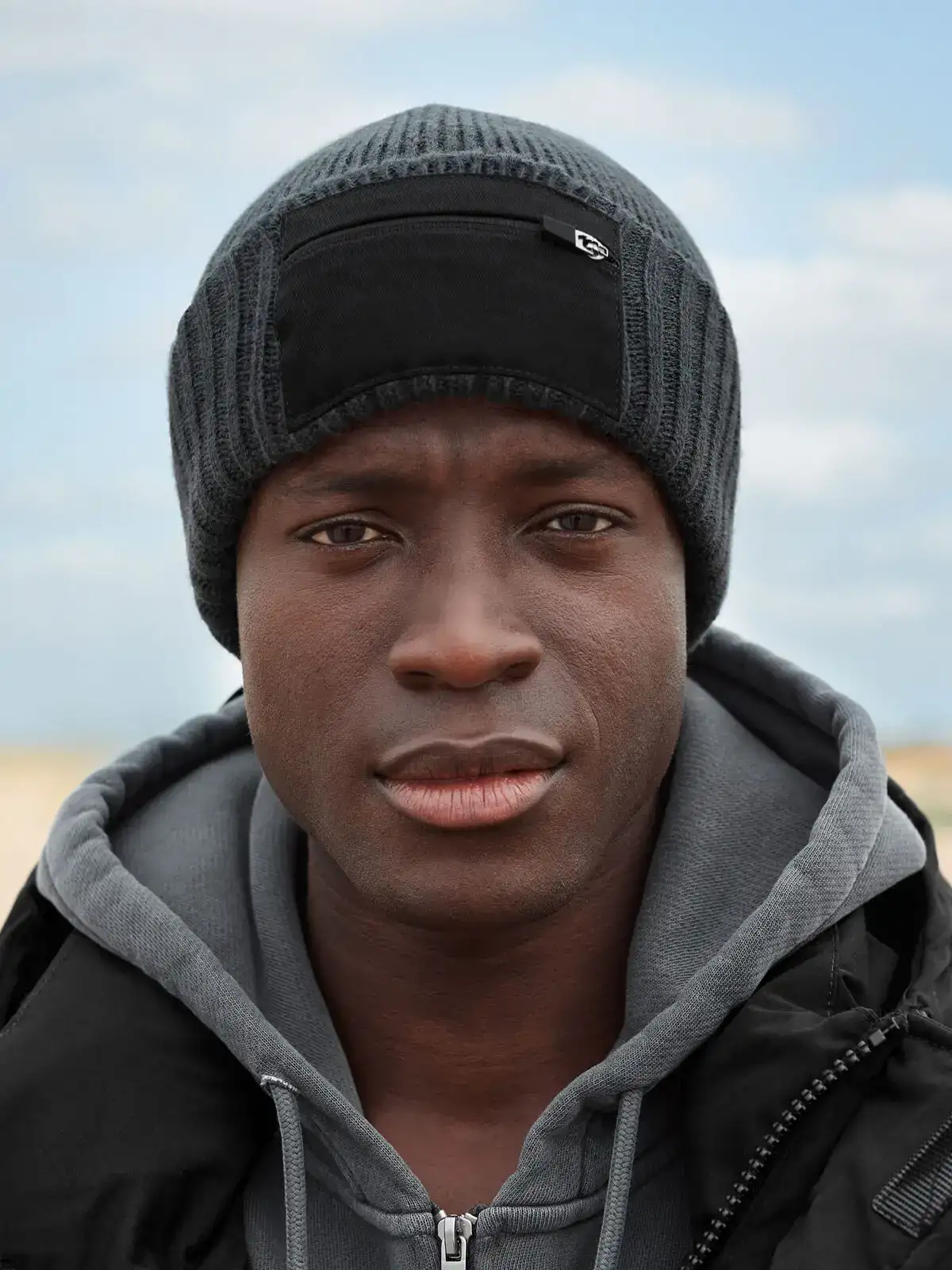 50% poliestere riciclato, 50% acrilico. Berretto in maglia a doppio strato,